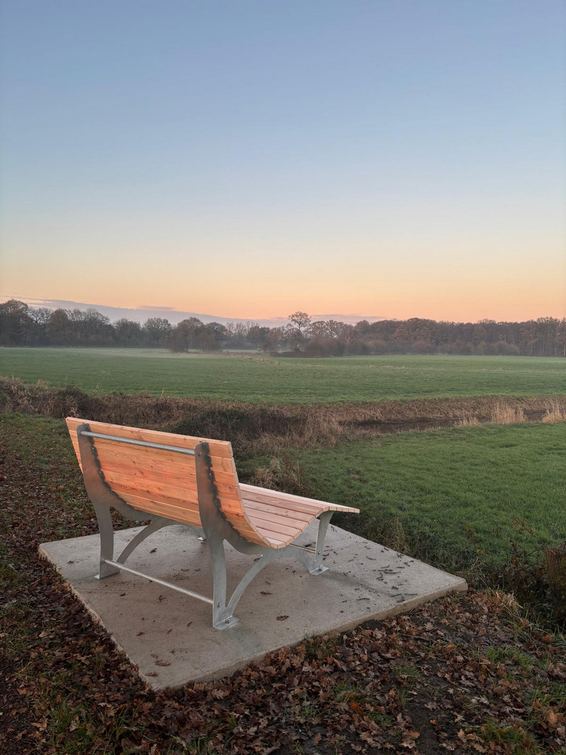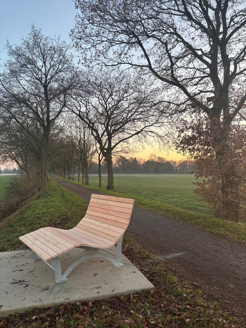 Gefertigt aus langlebiger, wetterbeständiger Douglasie fügen sich die Liegen harmonisch in ihre Umgebung ein. Das warme Holz und die markante Maserung verleihen ihnen eine natürliche Ausstrahlung und machen sie zu einem besonderen Blickfang. Sie eignen sich ideal für kleine Pausen beim Spaziergang, auf einer Radtour oder während eines Ausflugs durch das Gemeindegebiet.