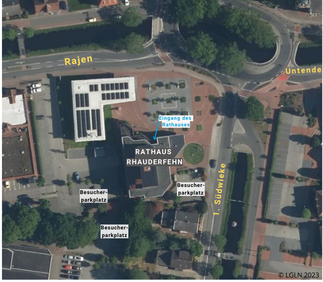 Ein Besucherparkplatz befindet sich, wenn man von der 1. Südwieke kommt, seitlich des Rathausgebäudes (siehe Skizze).